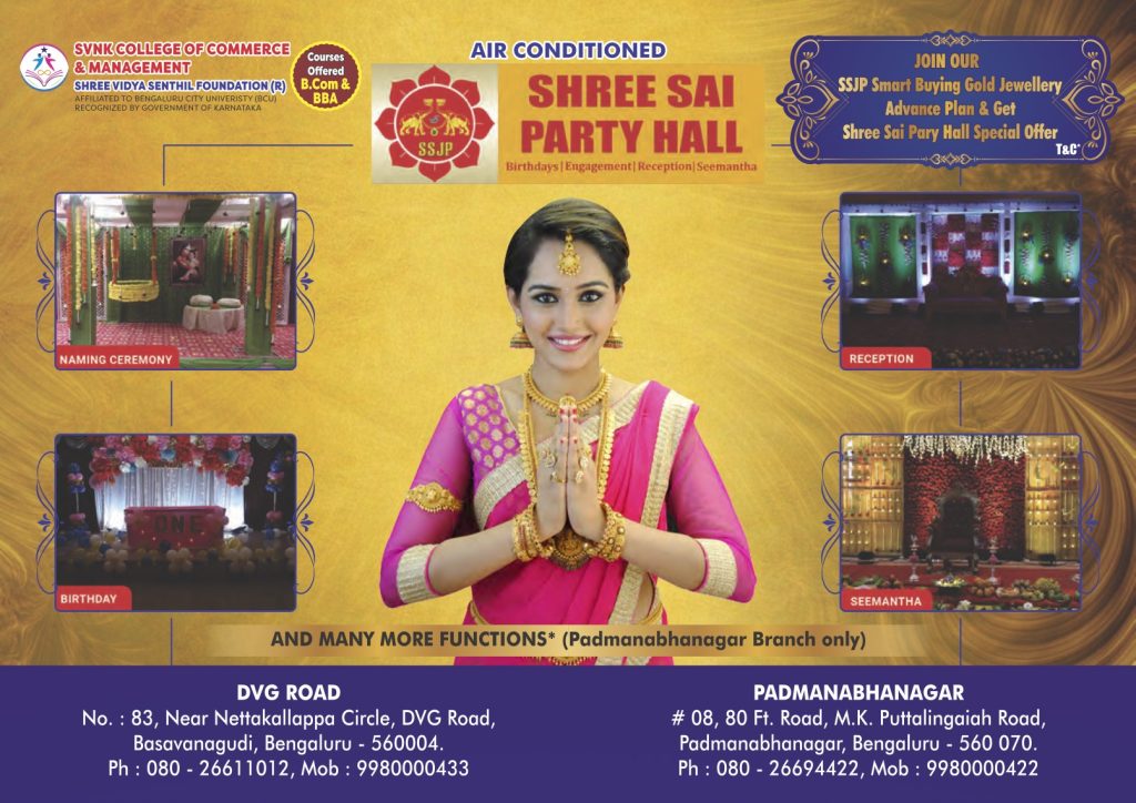 Shree Sai Party Hall, Padmanabhanagar 8, 3rd Floor, 80ft Road, M.K. Puttalingaiah Road Padmanabhanagar, Bangalore-560070 080-26694422